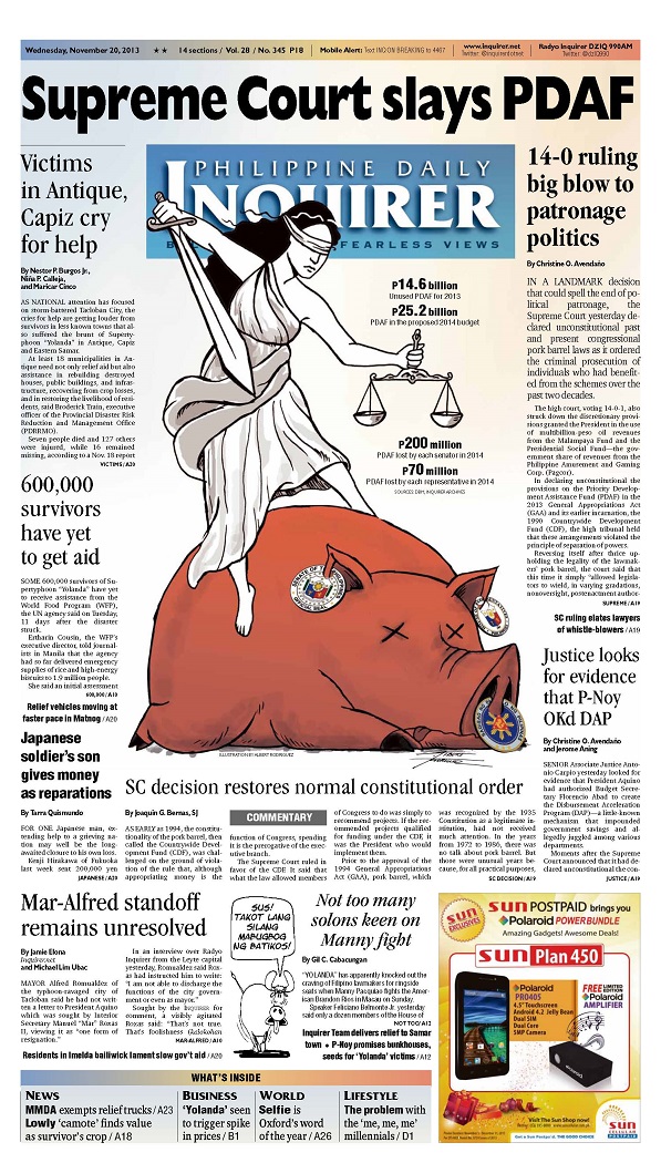 | The front page of Inquirer News heralding the Supreme Court decision declaring the pork barrel unconstitutional. |